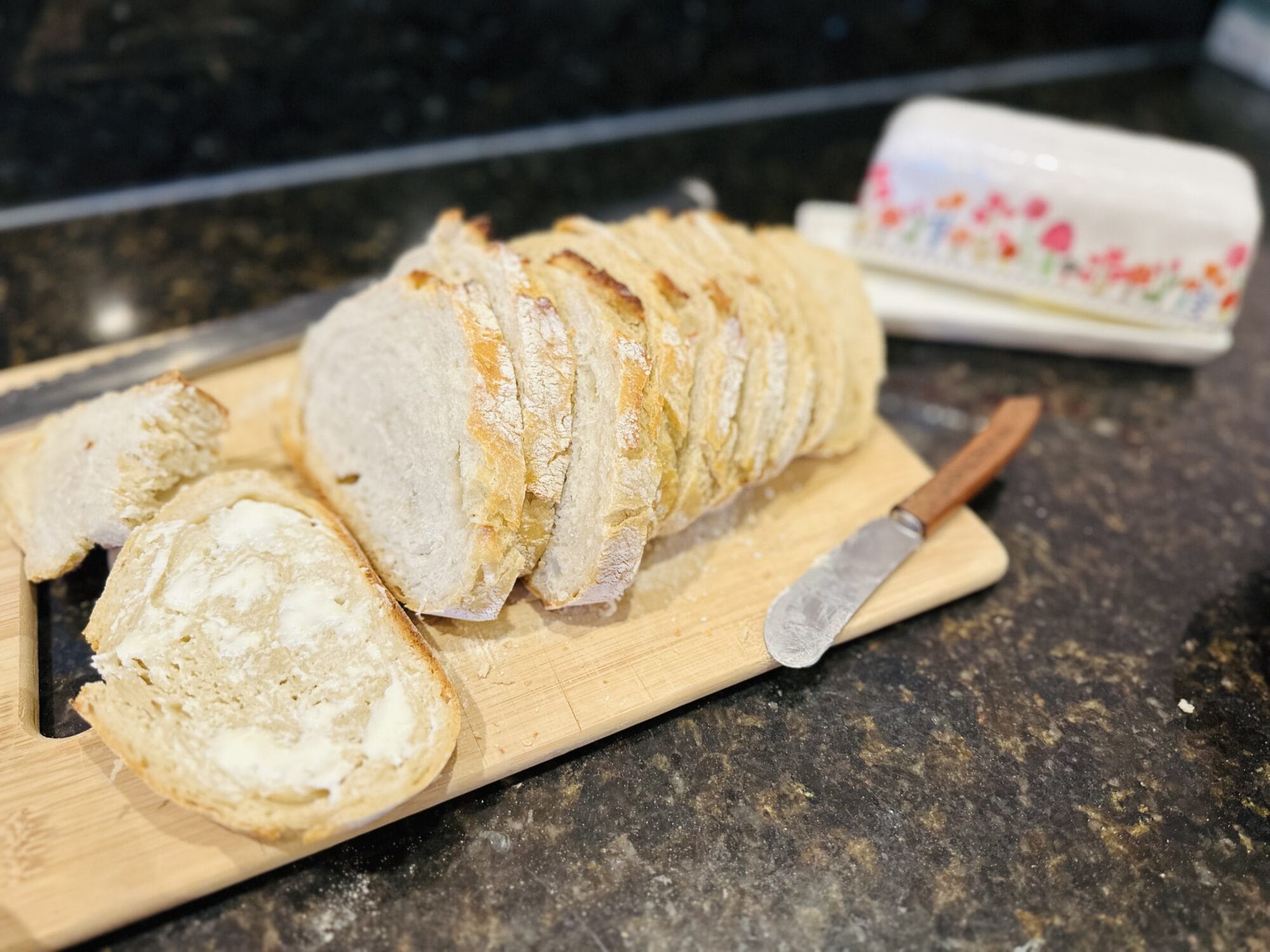 After dough has set overnight for 8-12 hours, put empty, oiled cast iron dutch oven pot with lid* in oven and let heat in oven to 425 degrees. While pot is heating in oven, dust counter/surface with flour and gently scoop out dough onto floured surface. Wet your hands with water as needed and gently (don’t mess with it too much or bread will become too dense) stretch dough into a rectangle shape. Let dough rest for 10 minutes. Remove dutch oven pot from oven. Fold the long ends of dough to the middle, overlapping each other (a trifold). Then fold the opposite ends of dough (top and bottom) to the middle, overlapping each other again (trifold style again, but the other direction) and place in hot dutch oven, folded side down. Place lid on dutch oven and bake in oven at 425 degrees for 30 minutes, then remove lid and bake another 15 minutes. Enjoy!
