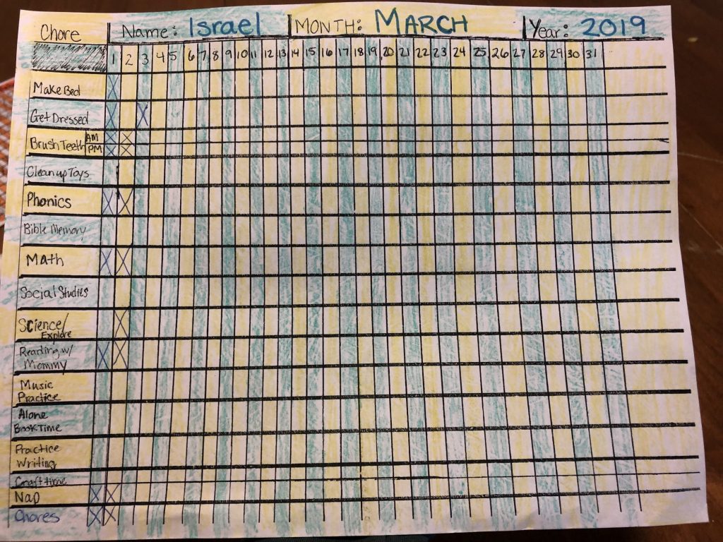 Israel also has a “chore pack:” little laminated cards that are stuffed inside a little plastic name tag with drawings of each of his chores on them (since he can’t quite read everything yet!) and the name of the chore/school subject with a number for the order in which it should be completed. Some of Israel’s cards purposely don’t have numbers on them so I can rearrange them however I want him to complete them that day…then I just have him check in between every card swap. He doesn’t always clip it on his clothes during the day. Sometimes we just keep it clipped on the wall and switch them out as we go through them. I first learned of the chore packs when my mom did them with some of my younger siblings. The idea came from Steve and Teri Maxwell (www.chorepacks.com).